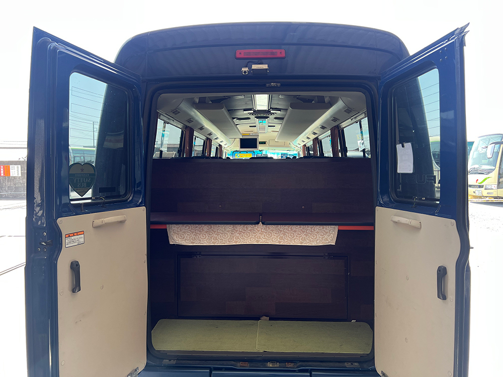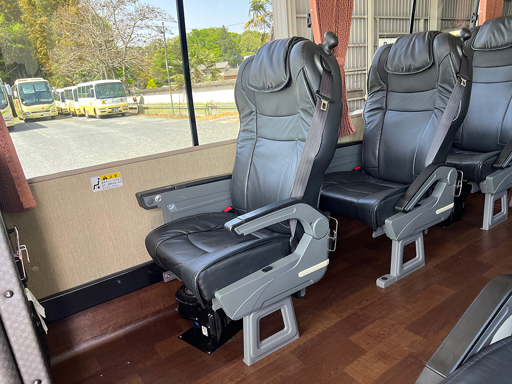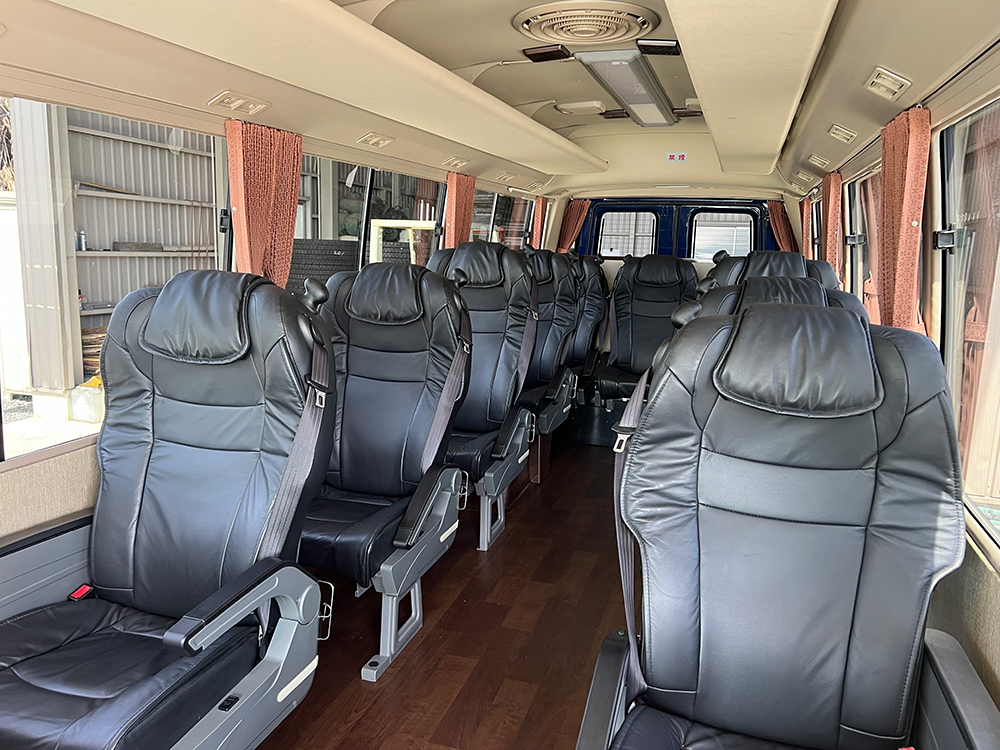 11名乗りのVIP小型バスは高級本革シートです。各席にはフットレストが付いています。それ以外にも収納式テーブル・コンセントなどあり、通常のご利用以外の他、VIPのご利用にも最適な車両です。