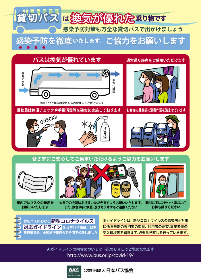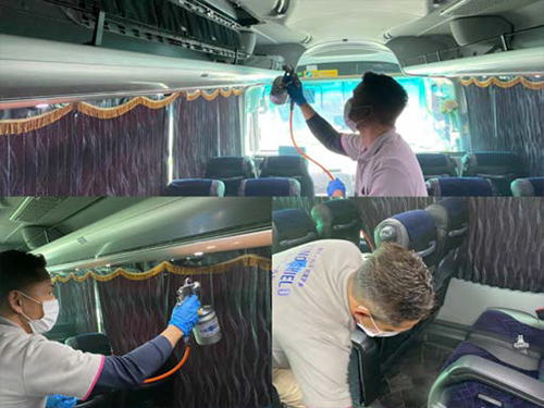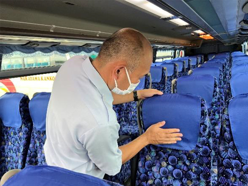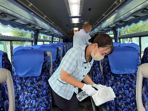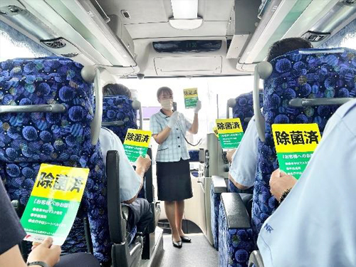 弊社は新型コロナウイルス感染症拡大にともない光触媒ハイブリッド銀チタンコート剤を使用した抗ウイルス・抗菌対策を、全車両・車内全体に施工いたしました。手の触れる箇所すべてを強制的に「まるごと抗菌」することで、接触感染から身を守り、安心・安全・快適な車両でお客様をお迎えいたします。