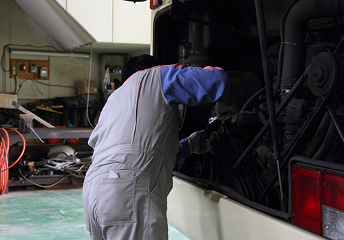 バスは万全な整備をしていても、いつ何時にトラブルになるか分かりません。当社では車両担当制を導入しており、各車両を自身でも日々点検を行い、遠方地での急なトラブルにも対応できるように日々鍛錬しております。